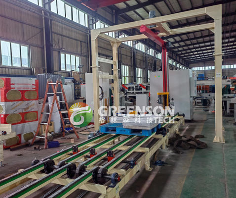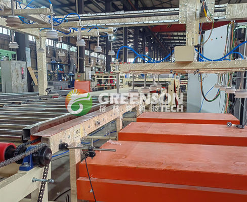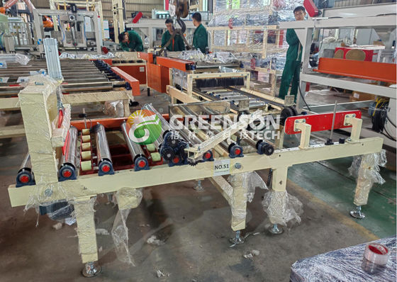 The cylinder pushes gypsum boards from the stack lift platform to the conveyor roll for PVC and aluminum film lamination.